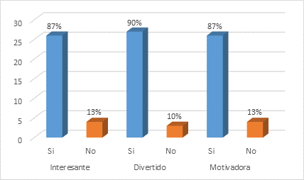 Al aplicar los elementos del juego en las clases prácticas de la educación física, se obtuvo una buena aceptación que supera al 87% del total de los alumnos, considerando a la nueva metodología como interesante, divertida y motivadora durante el proceso de enseñanza aprendizaje.