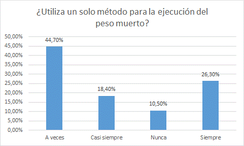 Sobre los métodos que utilizan los deportistas para ejecutar el peso muerto, se menciona que alrededor del 90% de ellos modifica su método a la hora de ejecutar el peso muerto. No obstante, casi la mitad lo hace “a veces”.