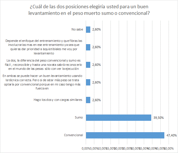 Sobre las posiciones preferidas para la realización del levantamiento en el peso muerto, las y los encuestados de alto rendimiento afirman que se sienten más cómodos con la variante convencional del peso muerto, aunque por otro lado el 39% de ellos afirma que se sienten más cómodos con la variante sumo en el levantamiento del peso muerto y finalmente el 2% no saben por cuál posición optar en el momento del levantamiento del peso muerto.
