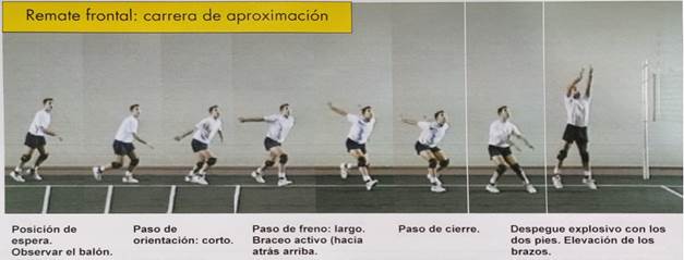 Respecto a las fases que componen la técnica del remate, algunos autores como (Valades, 2004) y (Cardona & Román, 2012), mencionan cinco fases que componen el remate; las cuales son: 1° Carrera de aproximación, 2° Batida, 3° Preparación para el golpeo, 4° Golpeo y 5° Caída. Cada fase con su importancia para lograr la mayor altura posible, golpear al balón con gran velocidad y precisión, finalmente la caída merece gran interés al estar dotada de equilibrio para evitar lesiones y reincorporarse rápidamente a las siguientes acciones de juego. Cómo, indica la Figura 1, la carrera de aproximación se subdivide en algunas sub fases.