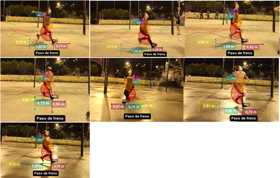 En la Tabla 2 se analizan los ángulos de las articulaciones del hombro, codo, cadera, rodilla y tobillo en el paso de freno que es donde debe haber una flexión en cadera y rodilla además que el ángulo del hombro respecto a la vertical debe ser lo más aproximado a 90° para generar un impulso con los brazos tipo péndulo hacia adelante en la siguiente fase.