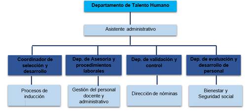 Entonces, se propone una estructuración de un departamento de talento humano, el cual ayudará a mejorar el ambiente laboral y, por ende, desempeñará varias funciones que contribuirá a los objetivos de la institución.