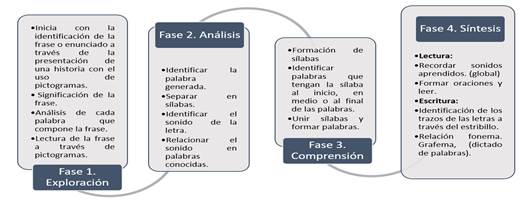 Fase 4. Síntesis: durante esta fase se aplica lo aprendido en las fases anteriores para concretar la lectura, con el reconocimiento de los fonemas para leer y comprender las oraciones y finalmente concretar en la escritura. De igual manera, en esta fase es necesario las audiolecturas y videolecturas, a través de herramientas tecnológicas para grabar el audio y videos que permitan evaluar el avance de la destreza, además con el uso de audios por parte de la docente a través de podcast.