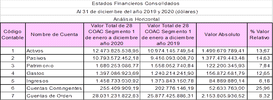 Del diagnóstico que se realizó a los estados financieros y resultados del ejercicio, mediante la aplicación de la técnica de análisis horizontal, se determinó que los gastos superaron en más de un 50% los ingresos en las COAC del segmento 1, disminuyendo sus excedentes en un -54,53% en el año 2020 con relación al año 2019, debido a los diversos cambios financieros que generó la incertidumbre de la pandemia.