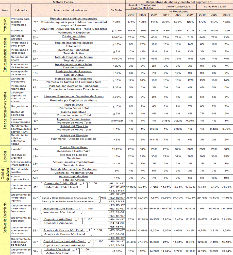 Para la aplicación del método PERLAS, se seleccionó tres cooperativas de ahorro y crédito del segmento 1: Juventud Ecuatoriana Progresista Ltda., Jardín Azuayo Ltda. y Santa Rosa Ltda., que presenten estados financieros con activos altos, medios y bajos, se elabora una matriz con los componentes del método perlas, (ver figura 8), se analizan, evalúan y detectan las eficiencias o deficiencias de las áreas de estudio en los años 2019, 2020 y 2021.