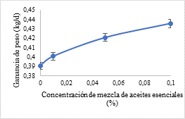 En la figura 1 (A y B) se puede observar gráficamente el comportamiento de los indicadores de rendimiento productivo respecto a la cantidad de aceites esenciales añadidos al alimento, y se corrobora la influencia significativa que tiene dicho aditivo tanto en la ganancia de peso como en el índice de conversión alimentaria.