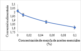 En este sentido, (Dong et al. 2019), demostraron efectos positivos sobre las funciones antiinflamatorias y antitumorales, reducción de diarrea y mejoradores del rendimiento del crecimiento en lechones destetados y suplementados con aceite esenciales de té. En otros estudios, (Martínez, 2012) y (Ayala et al. 2011), encontraron que la inclusión de aceite esencial de orégano en la dieta en pollos de carne y conejos mejora el índice de conversión alimenticia. Sin embargo, no existen reportes anteriores de la influencia de la mezcla en estudio sobre los parámetros productivos medidos.
