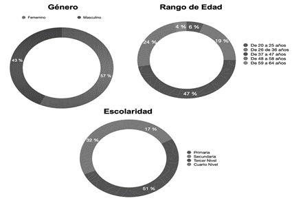 Finalmente, con el 19% el grupo de edades comprendidas entre 26 a 36 años. Todos los aplicantes de la escala aceptaron participar voluntariamente en el estudio. En cuanto al nivel de escolaridad, se manifiesta una población con alto grado de educación, debido a que: el 51,4% de la muestra poseen estudios de tercer nivel; el 31,9% posee estudios de cuarto nivel; y no existe personas de primer nivel.