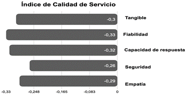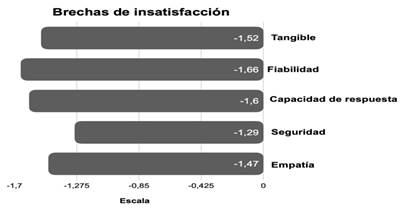 Si bien el presente estudio arroja resultados negativos en todas las dimensiones, donde la mayor brecha de insatisfacción para el cliente es la dimensión de fiabilidad con -1,66; la falta de comunicación por parte del asesor en informar cuándo concluirá la realización del servicio. Por su parte, la brecha de seguridad tiene una menor implicación de insatisfacción al cliente, sin embargo, no deja de ser un valor negativo. No existe un valor positivo para las dimensiones.