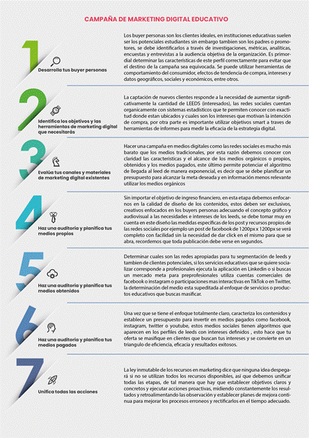 Con la presente investigación se procura desarrollar una estrategia innovadora de marketing digital educativo, por lo tanto, se planteó un esquema enfocado en 8 procesos secuenciales, los cuales servirán para potenciar los resultados eficientes en la aplicación de campañas de productos y servicios educativos, los cuales son: