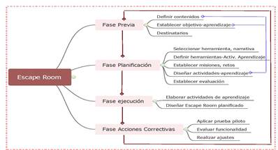 Fase planificación: en esta etapa el docente debe planificar paso a paso cómo será el diseño del escape room en el cual deberá hacer visible la gamificación y el juego para lograr cumplir el objetivo de aprendizaje planteado. A continuación, se describen las actividades a realizar para el diseño del escape room: