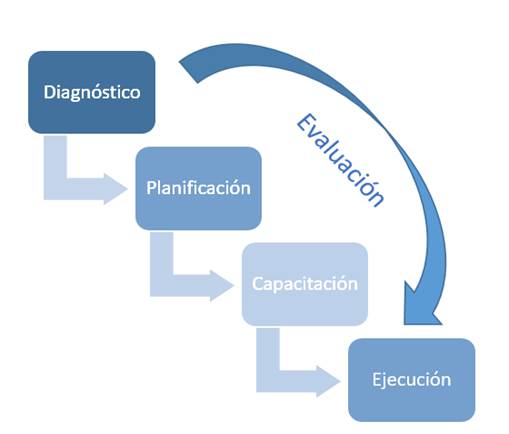 Evaluación: Este proceso se lo debe ejecuta de una forma trasversal es decir al largo de todo el proceso, puesto que sus resultados darán pautas de mejor continua y toma de decisiones a la marcha, mismas que permitirán optimizar el proceso de adquisición de competencias digitales y pedagógicas articuladas, fin último del perseguido.