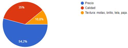 Los resultados de la Figura 1 muestran que, para el 54,2% de participantes lo más importante es el precio, seguido por la calidad a criterio de 35% y 10,8% cree que lo más importante es la textura.
