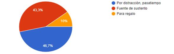 Los datos de la Figura 4 permiten observar que el 46,7% de los participantes adquieren las lanas e hilos por distracción, pasatiempo, el 43,3% porque es su sustento económico, y el 10% reciben estos materiales como regalo.