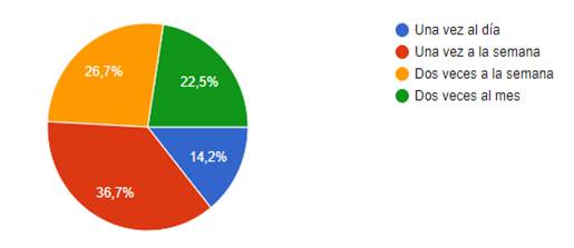 La frecuencia de compra de lanas e hilos se puede observar en la Figura 5, es así que, el 36,7% hacen sus compras una vez a la semana, el 26,7% dos veces a la semana, el 22,5% dos veces al mes, y el 14,2% una vez al día.