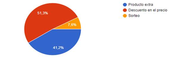 Para el 51,3% de los participantes son los descuentos en el precio lo que le induce a la compra de lanas e hilos, para el 41,2% es el producto extra, y el 7,6% menciona que es a causa del sorteo la adquisición de estos materiales.