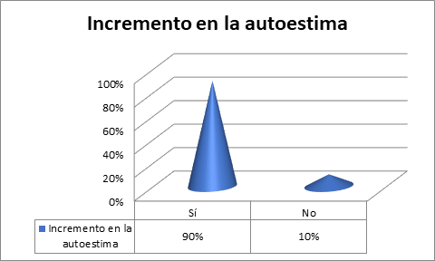 En concordancia con los resultados obtenidos sobre el incremento en la autoestima, se observó que 90% de los niños experimentaron un incremento en su autoestima y confianza en oposición a un 10%. Por consiguiente, se mostraron más seguros de sí mismos y más abiertos a enfrentar nuevos desafíos.