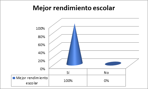 Tal como se observa en la figura 5, 100% de los niños de preescolar mejoraron su desempeño en el aula, cumpliendo a cabalidad con sus actividades y participando de forma activa en los juegos, las tareas y todas las asignaciones que el docente les indicó realizar. (Bello, Rionda y Rodríguez, 2010) en atención a experiencia previas, aseveran que la educación emocional constituye un proceso favorecedor para el progreso formativo del aprendiz. Desde esta visión, se pudo constatar que los niños se desenvolvieron mejor en la ejecución de cada una de sus acciones.