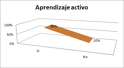 De acuerdo con lo revelado en la figura 1, se puede afirmar que 80% de los estudiantes desarrollaron un aprendizaje activo. La evaluación de las estrategias didácticas implementadas por el docente en el entorno educativo ecuatoriano confirmó que el enfoque de aprendizaje activo demostró ser especialmente efectivo en el progreso académico de los aprendices con un porcentaje de 80%, lo cual coincide con el aporte de Hernández e Infante (2016), por cuanto exponen que el rol del docente es importante para guiar el aprendizaje, ya que el mismo: “indica el trabajo independiente a desarrollar por los estudiantes: las tareas a ejecutar, las fuentes esenciales a consultar, y cómo trabajar con las mismas en el procesamiento de la información requerida para la autopreparación”. (p. 228) Los estudiantes participantes mostraron mayor compromiso, interacción y autonomía en su aprendizaje mediante las actividades aplicadas, lo que sugiere el fomento de la construcción activa del conocimiento y el desarrollo del pensamiento crítico. Por ende, gracias a la aplicación de estrategias variadas por parte del educador, se logró lo expresado por Hernández et al. (2015), quienes destacaron lo siguiente: “El logro de competencias por parte de los estudiantes implica métodos, técnicas metodológicas, estrategias, recursos, entre otros, dirigidos al estudiante, involucrando al docente como el creador de la metodología para favorecer el aprendizaje”. (p. 91)