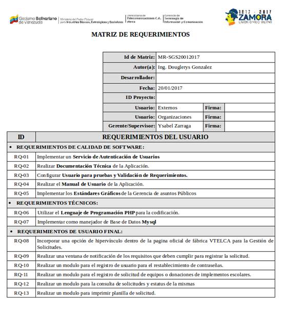 De acuerdo al cuestionario se permitió recabar y analizar todos los datos necesarios para lograr determinar con exactitud qué tipo de información requería el sistema propuesto. Luego de ello se llenaron dos matrices de requerimientos para el sistema de información propuesto, una donde se especifica los módulos donde trabajaran los usuarios externos, y otra para los módulos de personal administrativo de fábrica VTELCA, como se observa a continuación: