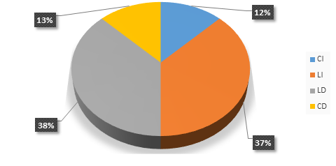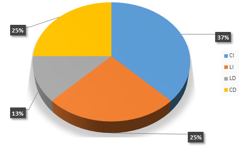 En cuanto a los estudiantes del Perú, se obtuvieron los siguientes resultados para el cortical izquierdo (CI) se obtuvo un porcentaje del 12%, para el límbico izquierdo (LI) con un 37%, en cuanto al límbico derecho (LD) un 38% y para el cortical derecho (CD), un 13, tal como se evidencia en el grafico 2.