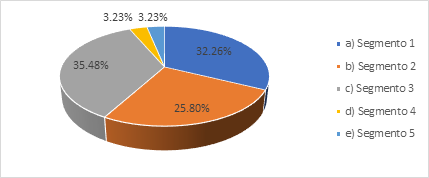 Segmento: en los resultados de la encuesta aplicada a los contadores de cooperativas de ahorro y crédito (COAC), se observa que, de un total de 31 encuestados, el 35.48% pertenecen al segmento 3, el 32.26% al segmento 1, y el 25.80% al segmento 2. Los Segmentos 4 y 5 representan un porcentaje menor, cada uno con un 3.23%. No se registraron respuestas ausentes en esta variable (Figura 1). Esto indica que la mayoría de las COAC encuestadas se encuentran en los segmentos 1, 2 y 3, mientras que los segmentos 4 y 5 tienen una presencia menos notable en la muestra.