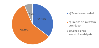 Factores relevantes: el 58.07% de las cooperativas consideran que la calidad de la cartera de crédito es el factor más importante. Le sigue la tasa de morosidad, mencionada por el 35.48% de los encuestados y el 6.45%, señala las condiciones económicas del país como un factor considerable en este aspecto (Figura 2). Estos resultados reflejan que la mayoría de las cooperativas priorizan la calidad de la cartera de crédito al determinar la suficiencia de provisiones, seguido por la tasa de morosidad, mientras que las condiciones económicas del país parecen tener menos influencia en este proceso.