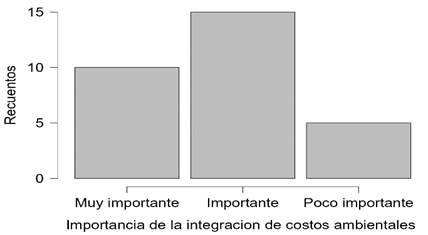 Beneficios económicos esperados: el cumplimiento de regulaciones ambientales es visto como el principal beneficio 36.67%, para evitar sanciones y mantener la licencia. Integrar costos ambientales mejora la eficiencia en el uso de recursos para el 33.33%, mientras que el acceso a nuevos mercados y clientes destaca para el 23.33%. Aunque la reducción de costos operativos es menos mencionada 6.67%, en efecto estos resultados subrayan la importancia de considerar los beneficios económicos de la integración de costos ambientales.