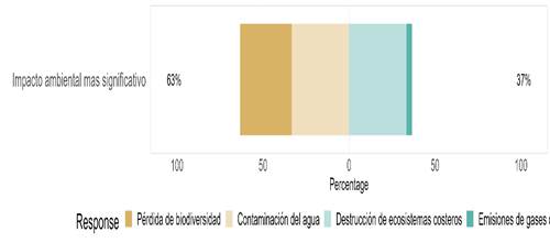 Impacto ambiental más significativo: los encuestados identificaron impactos ambientales clave: contaminación del agua y destrucción de ecosistemas costeros 33.33% cada uno, destacando la necesidad de abordar estos problemas. La pérdida de biodiversidad fue mencionada por el 30.00% de los encuestados, reflejando preocupación por la conservación biológica. Las emisiones de gases de efecto invernadero fueron mencionadas por un bajo porcentaje, 3.33%. En estos resultados resaltan la importancia de acciones específicas para mitigar estos impactos, como mejorar el manejo del agua y conservar ecosistemas costeros.