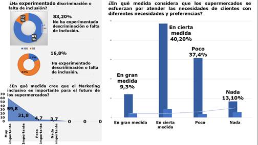 La presente investigación sobre el marketing inclusivo en supermercados arroja resultados significativos que destacan la importancia de abordar la diversidad y la equidad en las estrategias digitales de estas instituciones. A través de la encuesta realizada, se pudo obtener información relevante que se suma a otros hallazgos, como los proporcionados por técnicos de la Fundación Fabián Palacios, realizado por Arteaga et al. (2022), que resaltan la importancia de la inclusión y la atención a grupos vulnerables, como las personas con discapacidad.