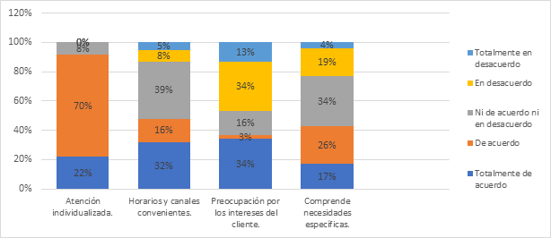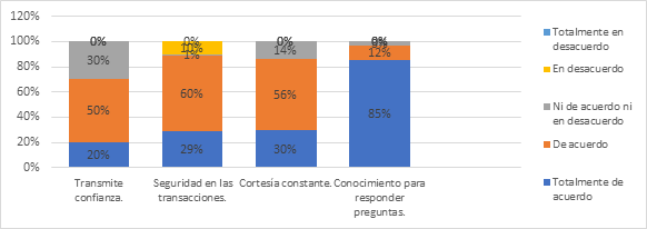 El hotel muestra fortalezas notables (Figura 3). El 97% de los encuestados valora positivamente el conocimiento del personal para responder a preguntas, lo cual genera confianza. Además, la cortesía constante de los empleados y la percepción de seguridad en las transacciones son ampliamente reconocidas, con un 86% y 89% de respuestas positivas, respectivamente. Sin embargo, el 30% de neutralidad en la confianza generada por el comportamiento del personal sugiere una oportunidad de mejora en este aspecto para consolidar aún más la percepción de seguridad entre los clientes.