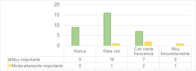 Manejo de los conflictos de interés relacionados con su rol profesional – compromiso de promover valores éticos dentro de la empresa: los resultados de la tabla 1 muestran que la mayoría de los encuestados (72%) están muy comprometidos con promover valores éticos dentro de la empresa. De este grupo, la mayoría maneja los conflictos de interés discutiéndolos con la administración (15 de 26), mientras que otros los evitan completamente (6) o los manejan según su criterio (4). Entre quienes están moderadamente comprometidos (28%), incluso prevalece la discusión con la administración (4 de 10), aunque una parte los maneja según su criterio (3) o los evita completamente (2). Esto apunta a que el compromiso ético está relacionado con el manejo responsable de conflictos, priorizando el diálogo con la administración como estrategia principal.