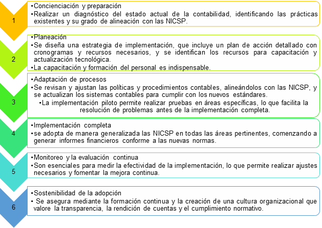 Para una adopción efectiva de las NICSP en las entidades del sector público, es esencial seguir un proceso estructurado que incluya las fases que se detallan en la figura 1: