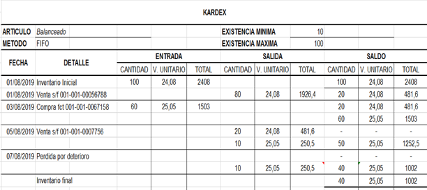 Para realizar un correcto control y valuación de inventario, primero se debe ejecutar el método de reposición, que se efectúa mediante la tarjeta de control o también conocido como kardex, dicho documento tiene como finalidad revelar información al departamento de compras, sobre el stock mínimo y máximo de cada producto (Fierro y Fierro,2016). Esta herramienta no reporta la cantidad ni fecha exacta para realizar el pedido de la mercadería. Además, permite comparar el costo histórico con el actual, al momento de solicitar el producto.
