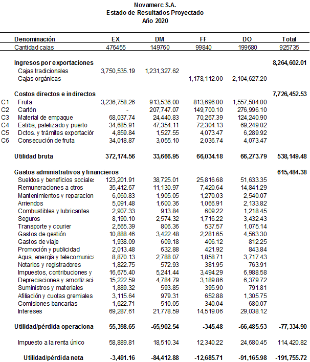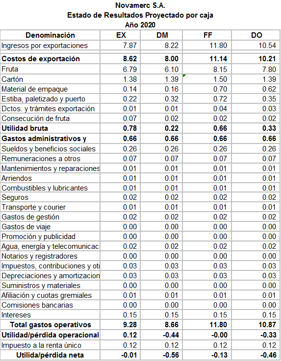 Cajas Fyffes: a partir de semana 19 del año 2019 se está exportando este tipo de caja, por lo que en el presupuesto del año 2020 se está considerando 2 contenedores de 960 cajas y al mismo precio de US $ 11.80 en exportaciones, y US $ 8.15 en compras.