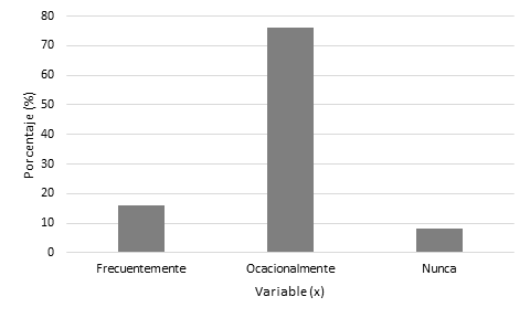 Posteriormente se consultó sobre la frecuencia en la que los docentes participan en cursos de formación virtual, los resultados se exponen en la figura 2, donde las valoraciones porcentuales permitieron determinar que el 16% de los maestros se capacita con frecuencia, mientras que el 76% han mencionado que su participación es estos procesos de formación es ocasionalmente y un aspecto que verdaderamente llama la atención es que el 8% manifestó que nunca se han capacitado virtualmente.