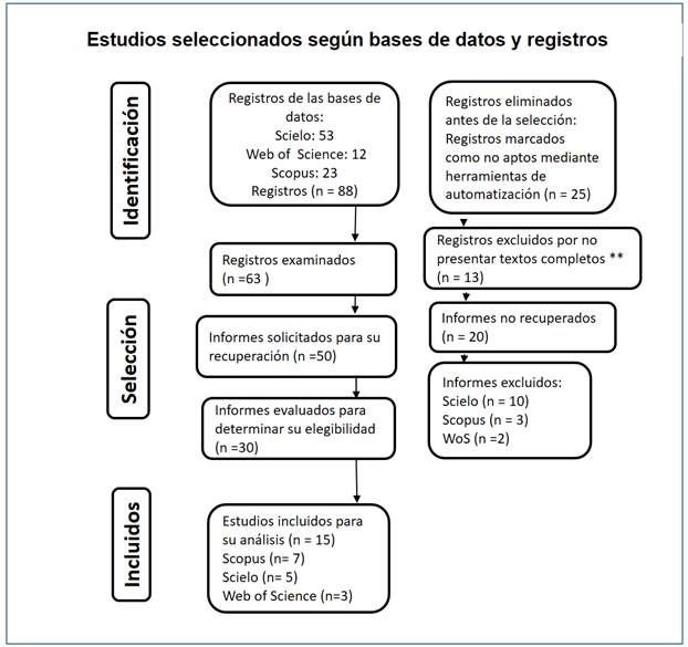 Según el estudio, de 88 estudios registrados, específicamente, 53 en Scielo, 12 en Web of Science y 23 en Scopus, se determinó que luego del proceso de filtración, se eligieron 7 de la base de datos Scopus, 5 de Scielo y 3 de Web of Science, es decir, 15 en total. Los criterios de selección fueron: estudios correspondientes a los últimos 7 años, pertenecientes a revistas indexadas en las bases de datos antes mencionadas, enfocados en la temática central y con contenido completo.