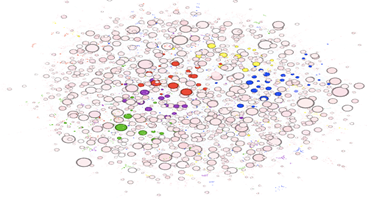 El grafo posee un grado de modularidad total de 0.89 con un gran número de aglomeraciones, casi todas desconectadas entre sí. La modularidad de la red es alta: hay conexiones sólidas entre los nodos dentro de los módulos pero son escasas las conexiones con nodos de otros módulos.