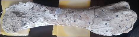 En el Laboratorio de Paleontología de la Escuela Politécnica Nacional, se tiene una variedad de fósiles que normalmente les tienen que hacer restauración o unir partes que se encuentran separadas, como es el caso del fósil del fémur de un mastodonte en el que la mayoría del hueso se encuentra completo, pero una parte se encuentra separado (ver figura 1). Entonces se puede proceder a escanear ambas partes para luego realizar la restauración y reconstrucción juntando las mallas en software de ingeniería inversa y de esta manera obtener un archivo digital; el mismo que contiene la información de la forma del fósil y que puede ser conservado como información valiosa de respaldo para el laboratorio. También con esa información se puede crear prototipos del fósil original pero ya reconstruido y completo
