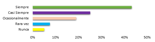 El 5% afirman que nunca han contado con un área de despacho y transporte., seguido del 9% que corresponde a rara vez, ocasionalmente el 26%, casi siempre el 17% y finalmente el 43% correspondiente a siempre, dando como perspectiva que la mayor parte cuenta con un área anteriormente mencionada en la zona tres del Ecuador.