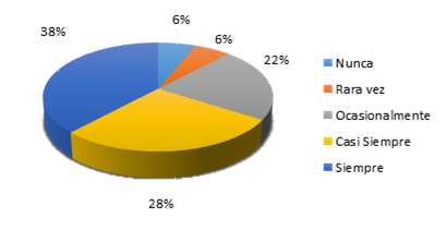El 6% afirman que nunca se identifican las mercaderías con códigos de barra, cantidades, lote, nombre, fecha de caducidad y características, el 6% corresponde a rara vez, ocasionalmente el 22%, casi siempre el 28% y finalmente el 38% correspondiente a siempre, dando como resultado que en la zona tres del Ecuador la mayor parte de mercaderías son identificadas mediante los métodos anteriormente mencionados.