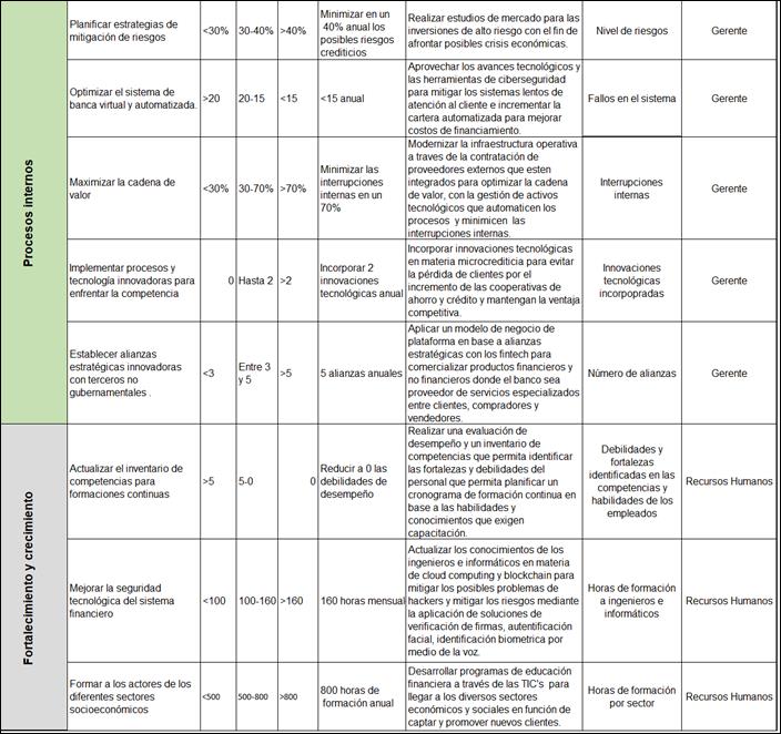 DO1. Aprovechar los avances tecnológicos y las herramientas de ciberseguridad (O1), para mitigar los sistemas lentos de atención al cliente (D1). DO2.Regular el elevado costo de captación (D3), teniendo en cuenta el posicionamiento de la marca en el sector no bancarizado (O2). DO3.Fortalecer los planes estratégicos y de fortalecimiento institucional (D4), para incrementar el acceso a créditos mediante tarjetas de crédito (O3). DO4.Desarrollar programas de educación financiera (D2), para llegar a los diversos sectores económicos y sociales (O4).