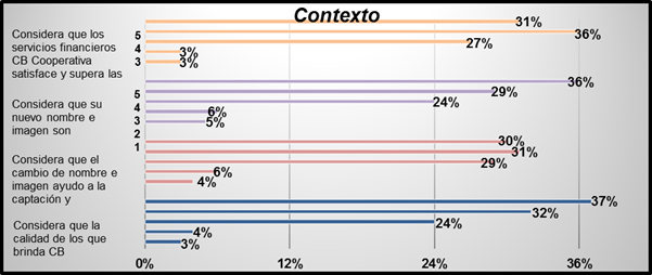 Además, señalan que lo que más les motiva para escoger a CB cooperativa de sus competidores es el servicio que reciben, siendo este de calidad y valor agrego que se brinda a la sociedad, cabe recalcar que el principal sentimiento que genera en ellos la marca es de confianza siendo un factor vital forjado por 27 años ya en el mercado financiero el cual se debe seguir trabajando y generando más seguridad hacia ellos. Referente a la propuesta se sugieren estrategias de branding innovadoras para el estado actual de la imagen corporativa, enfocado en el nuevo consumidor financiero y el branding herramientas digitales para potenciar el posicionamiento en el futuro.