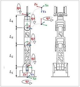 Figura 1. Diagrama con los sistemas de referencia, ejes y eslabones del brazo.