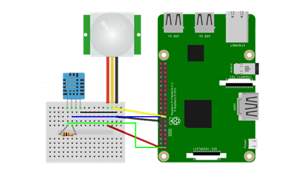 En el grafico podemos ver las conexiones que lleva el circuito en el cual se observa un sensor de movimiento Pir, el cual detecta la energía infrarroja de los cuerpos, un sensor de temperatura DHT11, se cuenta con una resistencia de 10 k, la cual va conectada al 3er y 4to pin del sensor DHT11, como se puede observar en la figura 3.