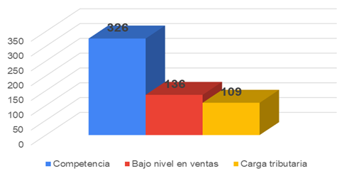 Las principales dificultades que enfrentan los emprendedores se observan en el cuadro anterior. La mayor parte de emprendedores, 326 de 571 es decir, 57% manifiesta que su principal conflicto es la competencia. 136 personas o sea 24% indican que tiene un nivel bajo en sus ventas, y 109 esto es 19% de los encuestados expresan que su principal dificultad es la carga tributaria.