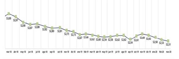 Figura 2. Evolución del precio del camarón: Promedio mensual (libras), marzo 2018 hasta marzo 2020.