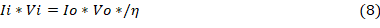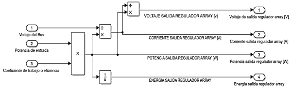 Para modelar el sistema propuesto en la figura 1, se implementará un convertidor DC/DC y un regulador de carga para baterías. La implementación del convertidor DC/DC permite mejorar el rendimiento global del sistema fotovoltaico y realizar un control a diferentes niveles. El modelo matemático más sencillo del comportamiento de un regulador se fundamenta en un principio básico aplicado a los convertidores ya sean reductores (Buck) o elevadores (Boost) (Marulanda-Durango, et al., 2017). Por lo general, en convertidores DC/DC la potencia de entrada es igual a la potencia de salida más las perdidas por eficiencia o factor de trabajo, tal como muestran las fórmulas (7) y (8)