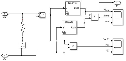 Figura 20. Modelado de la carga AC con bloques de medición RMS discretos en Matlab/Simulink.
