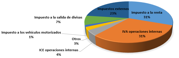 Los autores (Rivera, et al., 2019) clasifican a los impuestos establecidos en el Ecuador en dos grupos: directos e indirectos; Los impuestos indirectos son aquellos transferidos hasta el consumidor final y gravan a los pagos realizados por compra de bienes y servicios, mientras que, los impuestos directos gravan a los ingresos de aquellas personas naturales o jurídicas como resultado de sus actividades económicas. De acuerdo con el (Servicio de Rentas Internas, 2020) los impuestos que han causado mayor recaudación a nivel nacional son: impuesto a la renta, impuestos como IVA e ICE en importaciones, impuesto a la salida de divisas y el IVA en operaciones internas (ver figura 1).